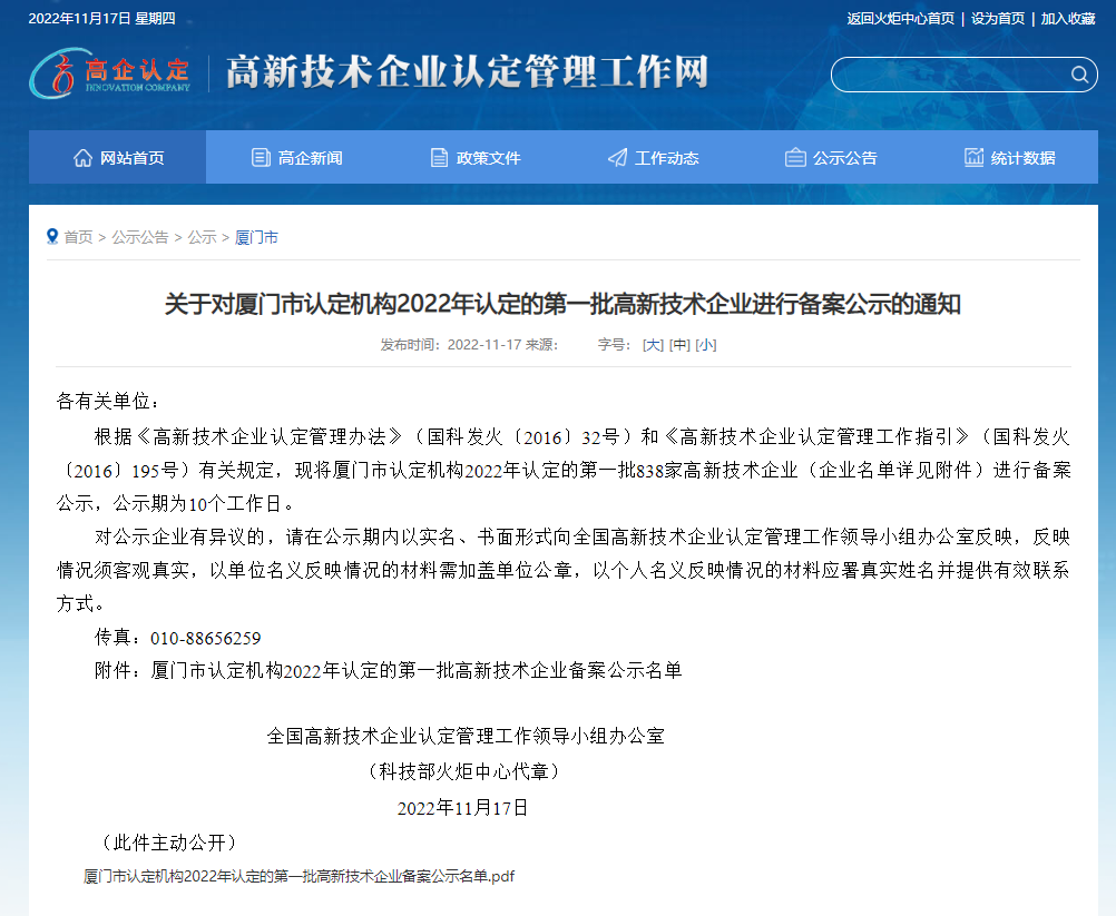 厦门市2022年认定的第一批高新技术企业备案公示名单