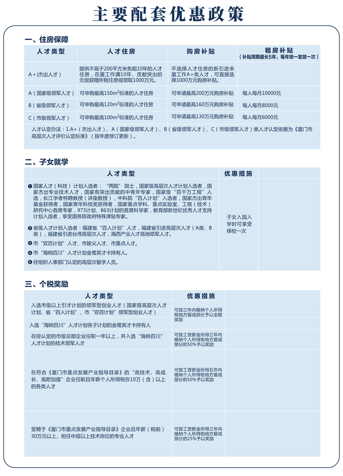 厦门市高层次人才配套优惠政策(顶尖人才、领军人才、骨干型人才、基础人才、柔性人才)