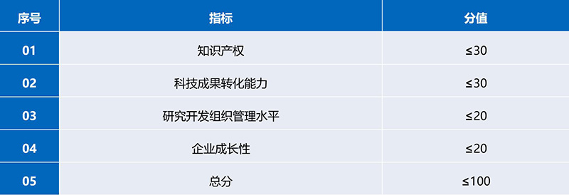 企业创新能力主要从知识产权、科技成果转化能力、研究开发组织管理水平、企业成长性等四项指标进行评价。各级指标均按整数打分,满分为100分,综合得分达到70分以上(不含70分)为符合认定要求。四项指标分值结构详见下表:
