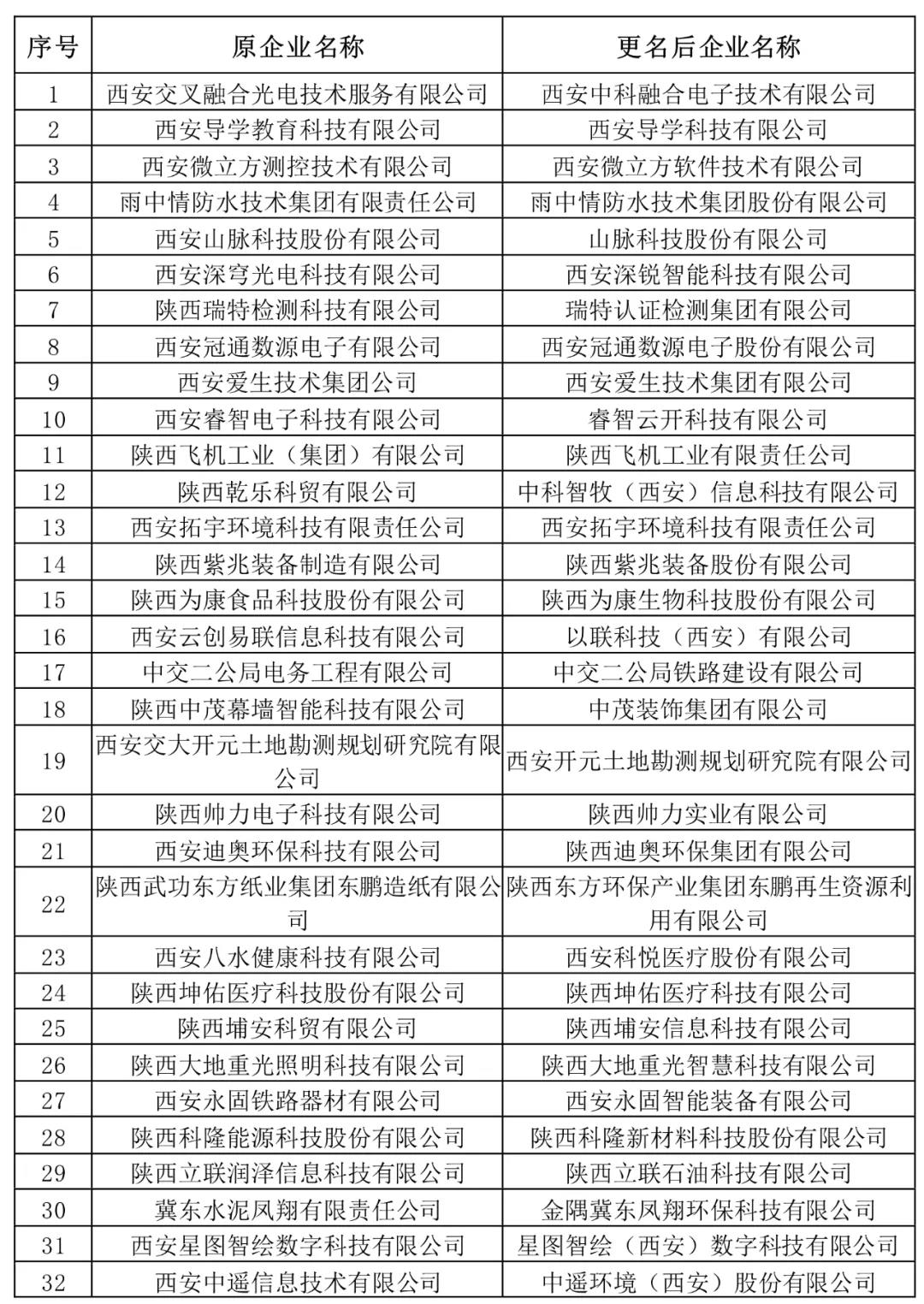 根据《高新技术企业认定管理办法》(国科发火〔2016〕32号)、《高新技术企业认定管理工作指引》(国科发火〔2016〕195号)有关规定,经企业申请,省高新技术企业认定管理工作领导小组办公室审核、公示,西安中科融合电子技术有限公司等32家企业更名,现予以公布。