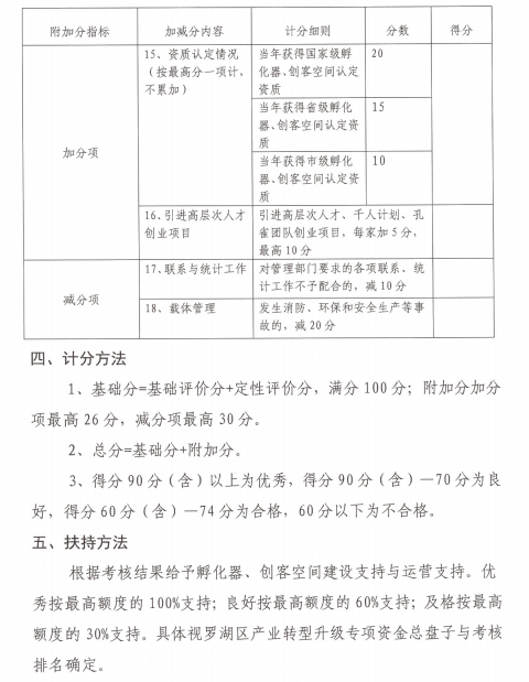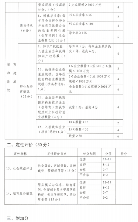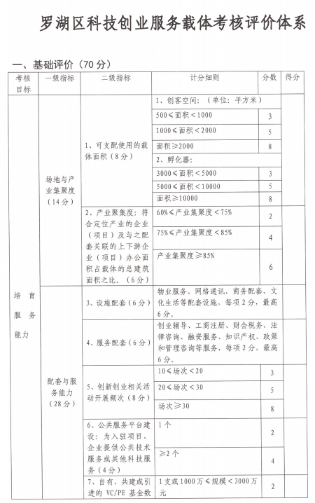 第十一条根据产业集聚度、管理服务能力、市场评价等建立评价指标体系,每年对罗湖区科技创业服务载体进行量化考核,考核适用百分制。考核指标根据国家、省、市、区的政策和相关文件进行适当调整。适时借力第三方评估机构,对载体的效能进行跟踪和专业评估。